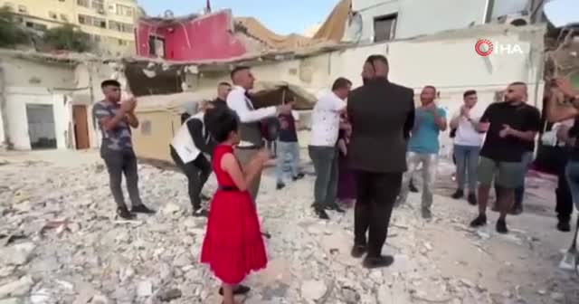 Filistinli çift, İsrail güçleri tarafından yıkılan gelin evinin enkazında düğün töreni düzenledi.