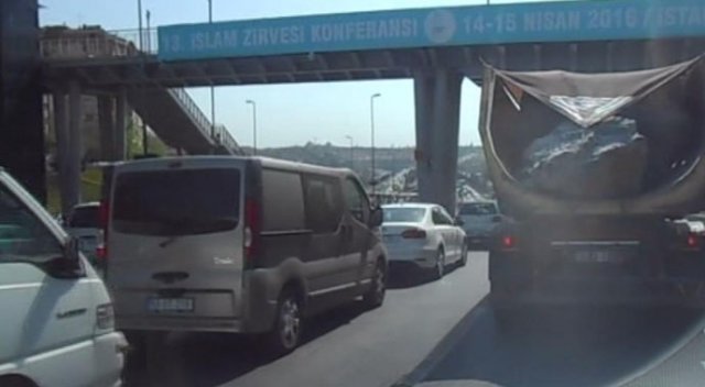 İstanbul’da E-5 karayolunda kasasında dev kaya parçaları taşıyan kamyonun hiçbir önlem almadan seyretmesi, yürekleri ağza getirdi.