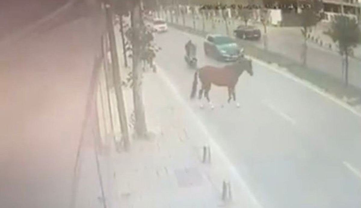 Sancaktepe’de başıboş gezerek yola çıkan at, seyir halinde olan motosikletle çarpıştı. Yere düşen motosiklet sürücüsü şaşkınlık yaşarken at ise koşarak uzaklaştı. Görenleri şaşkına çeviren o anlar bir iş yerinin güvenlik kamerasına yansıdı.