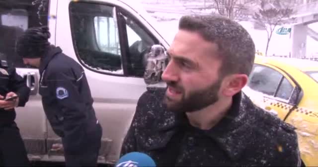 İstanbul’da yolda kalan bir taksi sürücüsünün, buz tutan yolda kamyonete çarpmamak ve daha rahat ilerleyebilmek için elini kullandığı anlar ilginç görüntüler oluşturdu.