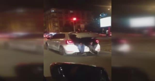 Kayseri’de, otomobilin bagajında oturarak seyahat eden iki genci gören vatandaşlar şaşkınlıklarını gizleyemedi.