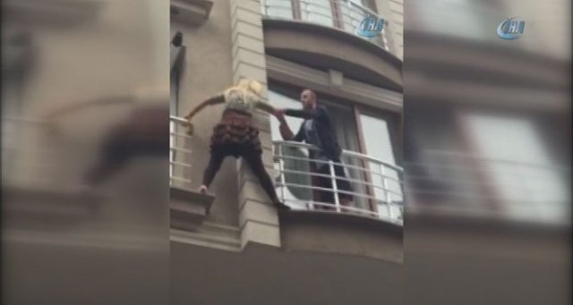 Yenibosna'da kocasından şiddet gördüğünü iddia eden kadın, balkondan sarkarak yardım istedi. Genç kadın yan dairede oturan komşusunun yardımıyla evinin balkonundan diğer balkona geçerken, yaşanan anlar saniye saniye cep telefonu kamerasıyla kaydedildi.