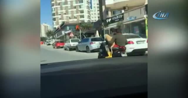 Adana’da iki kişi motosiklette kucaklarına aldıkları koyun ile yolculuk yaptı.