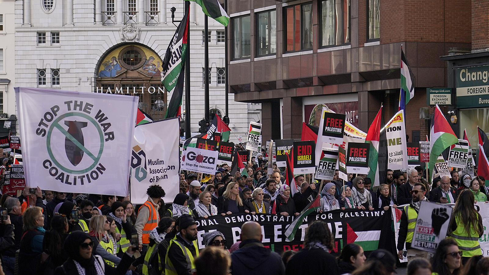 İngiltere İçişleri Bakanlığının engelleme çabasına rağmen yüz binlerce kişi, Londra’nın sembolleri arasında yer alan Hyde Park’tan ABD Büyükelçiliğine kadar yürüdü. Filistin'e destek için bir araya gelen insanlar ablukanın kaldırılması ve derhal ateşkes sağlanması çağrısında bulundu.