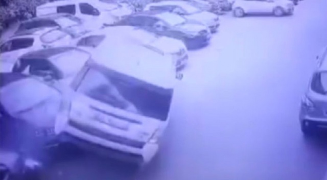 Güvenlik kameralarına yansıyan görüntülerde, lüks cip park halindeki bir araca çarparak sürüklüyor. Cip ardından otoparktaki araçların üstüne çıkıyor. Bir araçtan diğer araçların üstüne çıkan cip 5 aracı daha biçtikten sonra yola iniyor. Cip dururken, araçlarda maddi hasar olduğu görülüyor.
