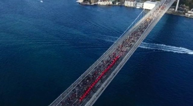 15 Temmuz Şehitler Köprüsünde binlerce kişinin katıldığı 38. Vodafone İstanbul Maratonu havadan görüntülendi.
