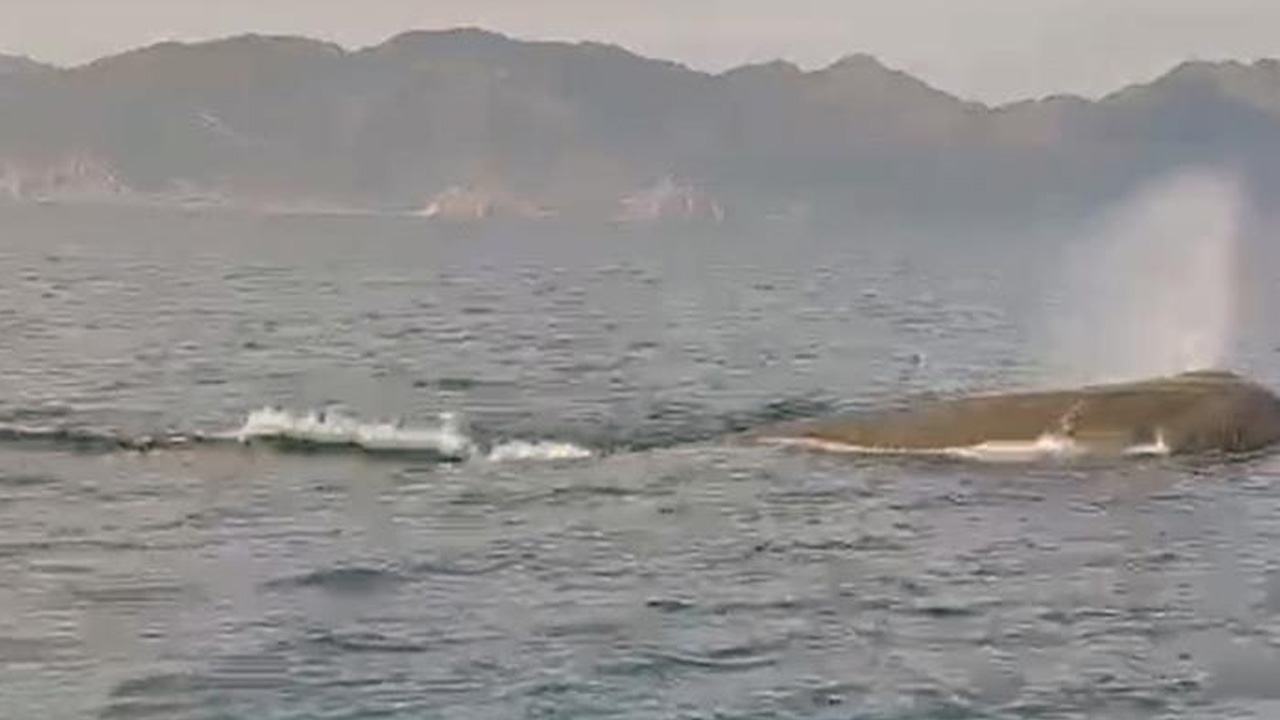 Muğla’nın Marmaris ilçesi açıklarında bir anda su yüzüne çıkan dev balina görenleri şaşkına çevirdi. O anlar bir cep telefonu kamerası ile kaydedildi, görüntülerde tek başına yüzen balinanın zaman zaman su püskürterek uzaklaşması yer aldı.