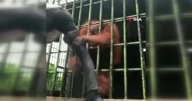 Orangutan bacağından yakaladığı adamı bırakmadı