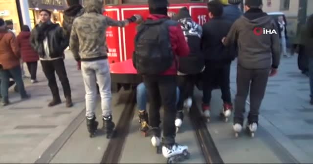 Beyoğlu Taksim ve İstiklal Caddesinde, bir grup patenli gencin seyir halindeki nostaljik tramvayın arkasına tutunarak yaptığı tehlikeli yolculuk, görenlerin yüreklerini ağızlarına getirdi. Gençler vatandaşların uyarılarına rağmen tehlikeli oyunlarına devam ederken, yaşanan o anlar kameraya yansıdı.