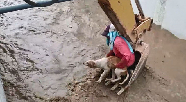 Ekvador’da bir köpek, Pasaje Canton bölgesinde sel suları sebebiyle coşkun akan sulama kanalına düştü. Kanal yakınlarındaki inşaat görevlileri, telsizden gelen uyarı üzerine çalıştıkları kazıcı makinesiyle kanalda tedbir aldı. Abel Murillo adındaki işçi, kazıcının kepçesine binerek suya yakın yerde pusuya yattı. Enkaz parçaları arasında hızla üzerine doğru gelen köpeği yakalayan işçi, korkuya kapıldığı için kendisini ısırmaya çalışmasına rağmen hayvanı kepçeye almayı başardı. Boğulmaktan kurtarılan köpeğin şok geçirdiği ama ciddi bir yara almadığı görüldü. İşçiler aralarında para toplayarak köpeği veterinere götürdü. Köpeğe iltihaplanma ve enfeksiyon tedavisi başlatıldı.