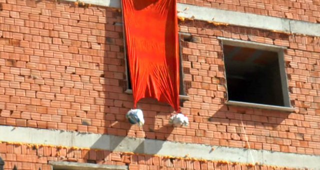 Tekirdağ'ın Çerkezköy ilçesinde, 7 katlı bir inşaattan uçlarına piknik tüpü bağlanıp bomba süsü verilerek aşağıya sarkıtılan ve üzerinde bir terör örgütünün adı yazan kırmızı renkli bez polisi alarma geçirdi.