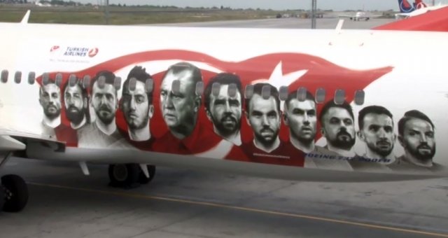 Türk Hava Yolları’nın (THY) EURO 2016 için Milli Takım’a tahsis ettiği ve Fatih Terim ile futbolcuların fotoğraflarıyla giydirilen uçak ilk kez görüntülendi.