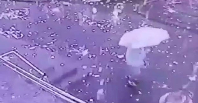 Rusya'da bir binanın çatısına yıldırım isabet etti. Binanın önünden geçen yaylalar, çatıdan saçılan kıvılcımların arasında kaldı.