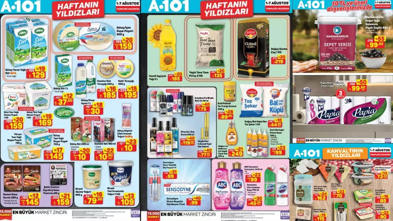 A101 Haftanın Yıldızları kataloğu yayımlandı. Her hafta Cuma'dan Perşembe'ye kadar mağaza raflarında indirimli olarak satışa sunulan ürünler arasında Süt, Kaşar Peyniri, Süzme Peynir, Tereyağı, Beyaz Peynir, Sucuk, Çay, Şeker, Ayçiçek Yağı yer aldı.