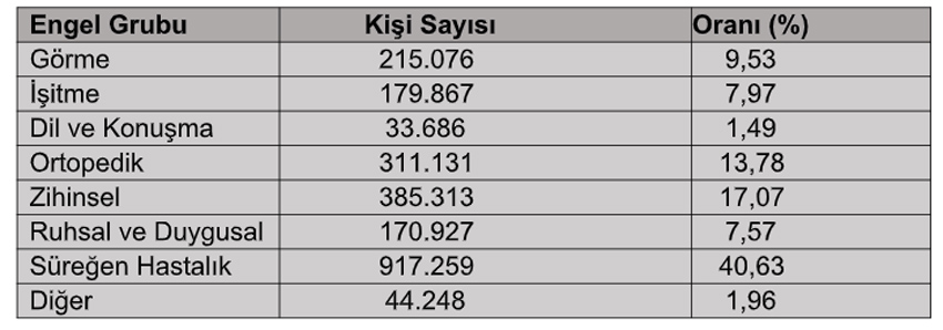 Aile ve Sosyal Politikalar Bakanlığının 2022/Ocak Yaşlı ve Engelli İstatistik Bülteninde; Ulusal Engelli Veri Sisteminde kayıtlı ve hayatta olan engelli sayısı; 1.414.643’ü erkek, 1.097.307’si kadın olmak üzere 2.511.950’dir. Ağır engeli olan kişi sayısı 775.012’dir. Veri sisteminde kayıtlı ve hayatta olan engellilerin engel gruplarına göre dağılımlarına ise aşağıdaki tabloda yer verilmiştir.