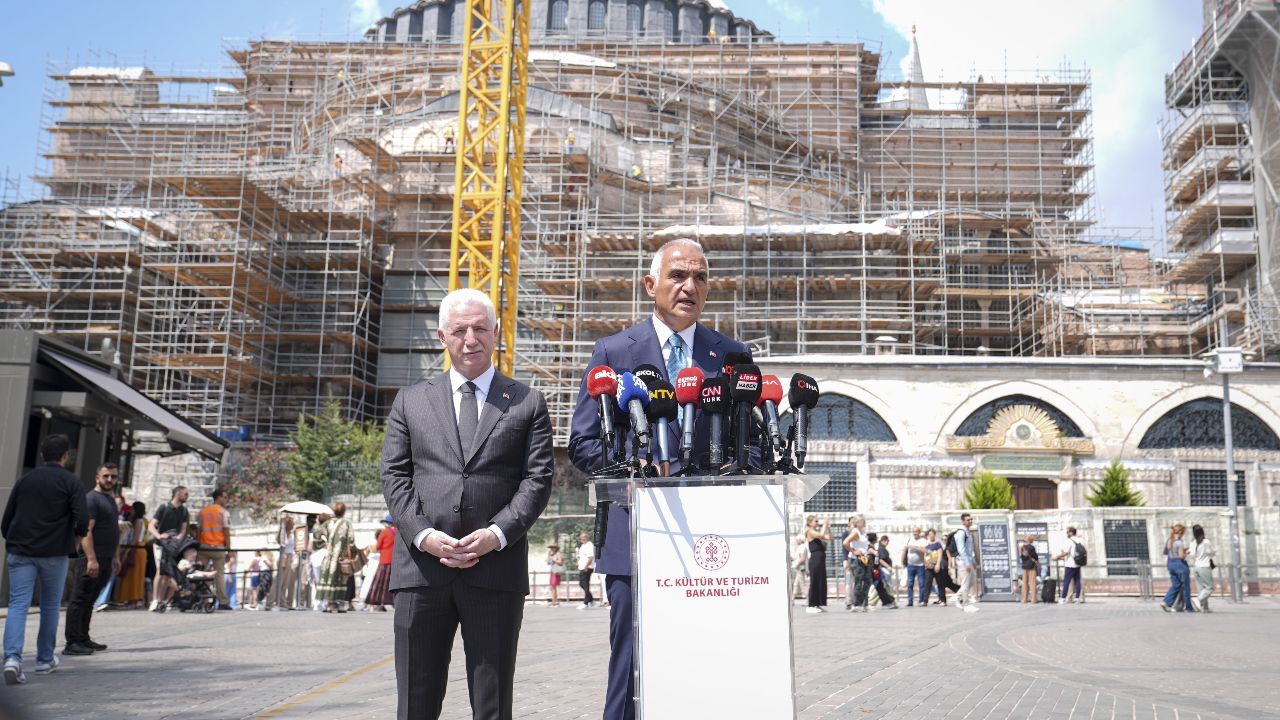 Ayasofya Camii’nde 2023’ten beri devam eden büyük restorasyon hakkında da bilgi veren Bakan Ersoy, türbe ve yan binalardaki yenileme çalışmalarının tamamladığını, minareler ve dış cephedeki çalışmaların ise devam ettiğini söyledi. Ersoy, güçlendirilmesi gerektiği düşünülen ana kubbe için de çelik konstrüksiyon ve koruyucu brandadan geçici bir örtü sistemi kurduklarını kaydederek “İç mekândaki mozaik restorasyonları için 43,5 metre yüksekliğinde, ibadetleri aksatmayacak bir çelik platform sistemini de inşa edeceğiz” diye konuştu.