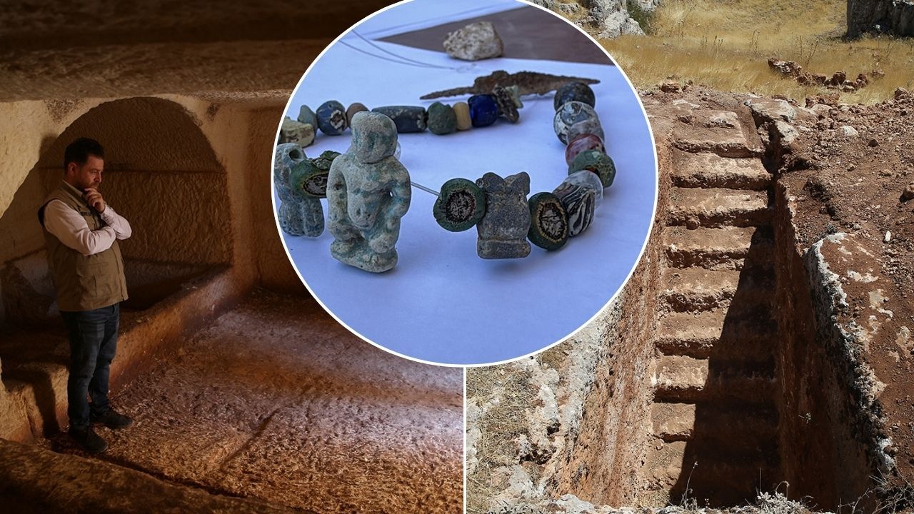 Çalışmalarda 2 bin 100 yıllık bir mezar ile içerisinde çeşitli figürler bulunduğunu aktaran Alkan, yapılan incelemede figürlerin, Mısır kökenli Tanrı Pataikos tasvirli fayans amulet (nazarlık), çeşitli boncuklar ve farklı amuletlerden oluştuğunu ifade etti.