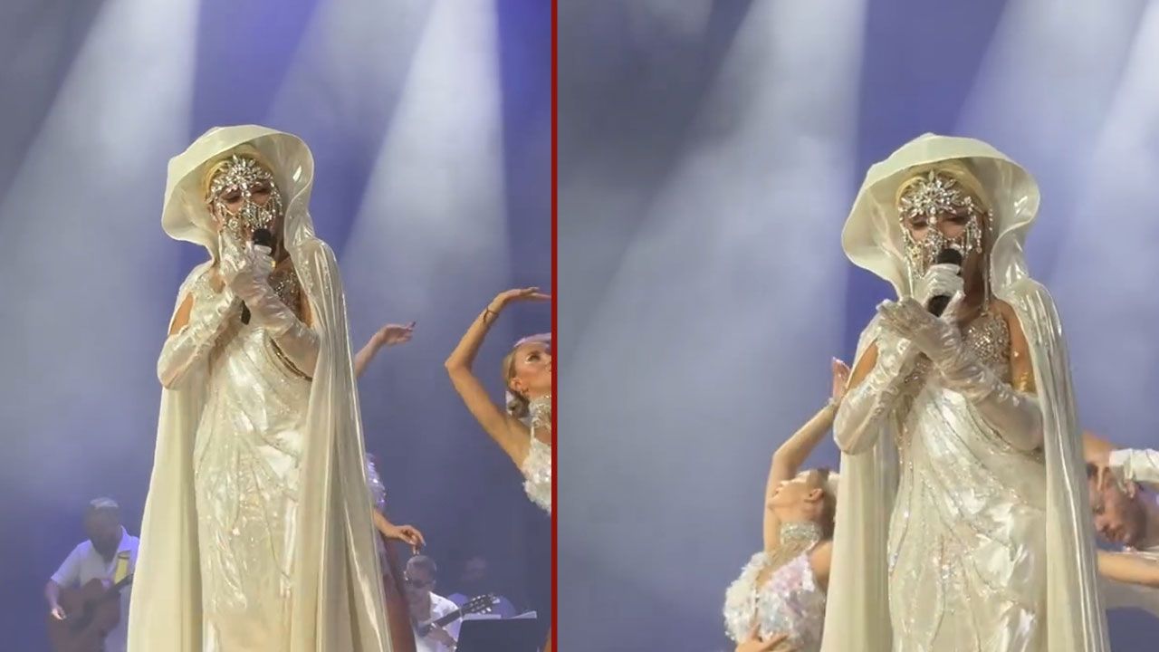 Pekkan, sahneye tamamen taşlarla işlenmiş bir maske ile çıktı. İlk yarıda giydiği baştan sona inci beyazı, taş süslemeli elbisesinin ardından ikinci yarıda giydiği gold, siyah ve gümüş işlemeli bir kıyafet tercih etti.