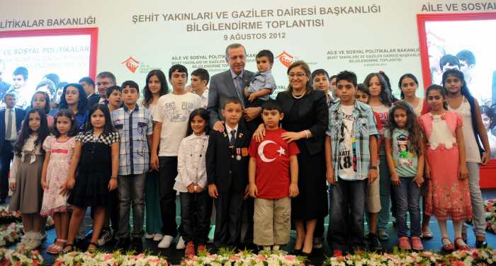 Başbakan Erdoğan, konuşmasının son bölümünde ise, şehit yakınları, gaziler ve terör mağdurları ile ilgili kanunun TBMM'de yasalaştığını hatırlatarak, "Bu yasa ile şehit yakınlarımıza tanınan istihdam hakkını birden, ikiye çıkardık. Şehidimizin eşi, çocuğu ve kardeşlerinin yanı sıra anne babası da bu haktan artık yararlanabilecekler. Şehit ailelerimiz için sıkıntılı durumlar oluşturan malullük ve muhtaçlık şartını da artık bu yasayla da kaldırdık. Anne babalara ödenen maaşlara belli bir taban getirdik. Böylece maaşlarda aylık 250 liranın üzerinde bir artış sağladık. Gayrimenkul ivmelerinde, toplu taşıma araçlarından yararlanmada bazı kolaylıklar sağladık. Şehit tanımını değiştirdik, kapsamı genişlettik. Terör mağduru olan sivil vatandaşlarımızı da şehitlik kapsamına aldık" diye konuştu.