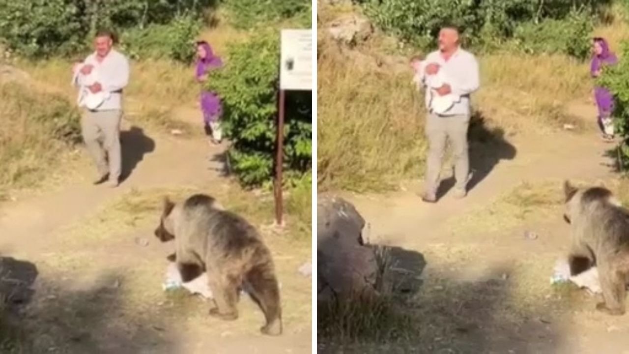 Kucağında bebek bulunan vatandaşa yönelen ayının saldırı anı ise cep telefonu kamerasıyla görüntülendi. Görüntülerde ailenin büyük panik yaşadığı, çevredeki vatandaşların ise korkuyla kaçıştığı görüldü.