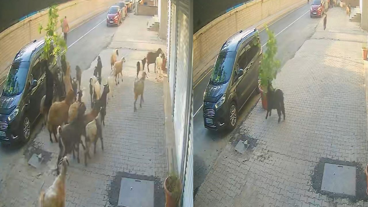 Bir çoban tarafından sürü halinde sokaktan geçirilen koyun ve keçiler arasından bir grup, işyerinin önündeki saksıya yöneldi. Önce yapraklarını yiyen keçiler, ardından saksıyı devirmek için uzun süre uğraştı. Çabalarına rağmen başarılı olamayan keçiler teker teker pes ederken, içlerinden biri inatla denemeye devam etti. Dakikalar süren uğraşın ardından keçi sonunda limon ağacını devirmeyi başardı ve olay yerinden uzaklaştı. Devrilen saksı ise kısa süre sonra binadan çıkan bina sakinleri tarafından yeniden düzeltilerek yerine konuldu. Yaşanan bu ilginç anlar işyerinin güvenlik kamerasına yansırken, görenleri gülümsetti.