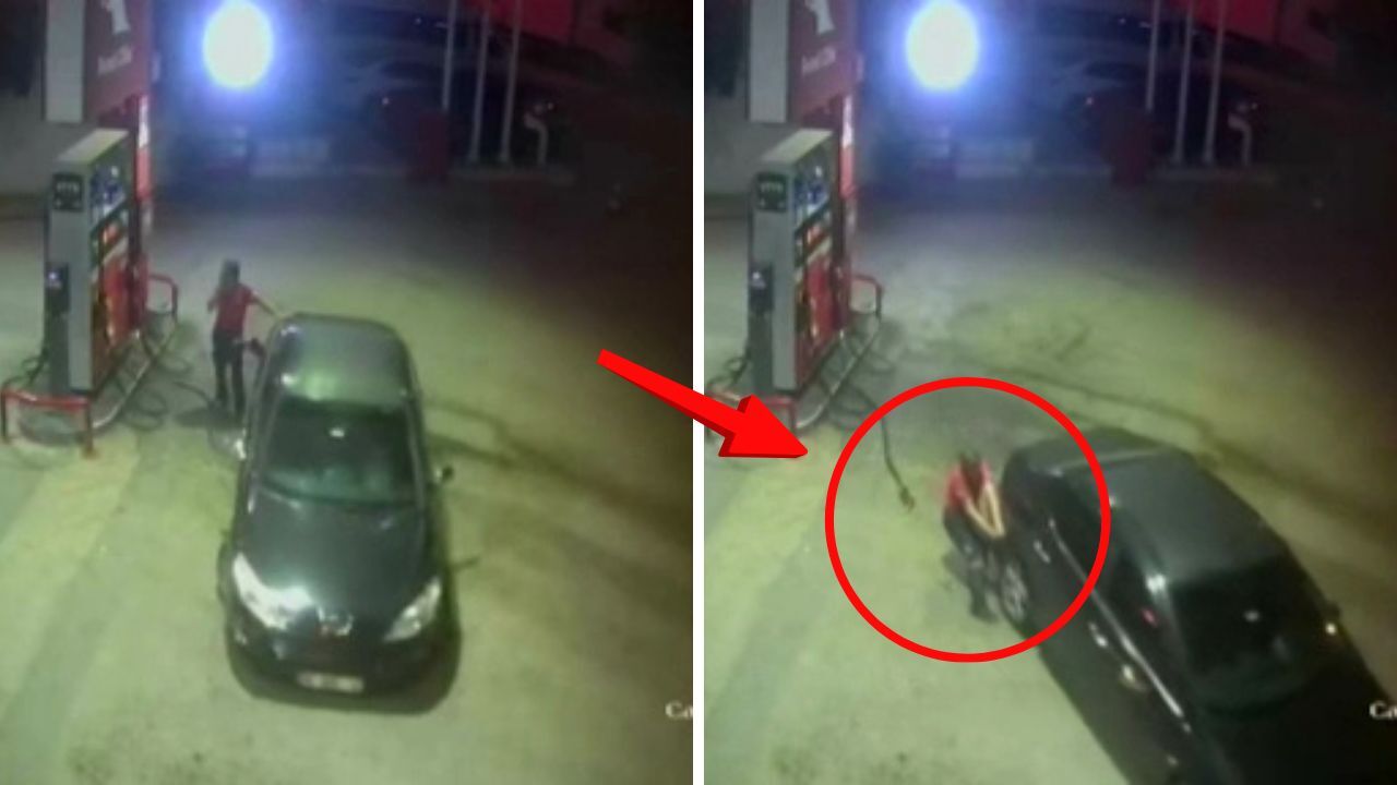Yakıt almak için istasyona giren otomobilin sürücüsü araçtan inip ödeme yapmaya girdi. Yakıt tabancası takılıyken hareket eden otomobil herkesi şaşırttı. Aracın kaymasına engel olmaya çalışan pompacı tabancanın borusuna asılıp otomobili durdurmaya çalıştı.