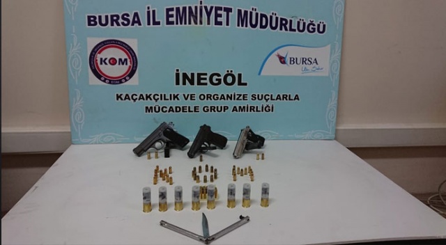 Bursa'nın İnegöl İlçesine bağlı Osmanbey caddesi üzerinde bulunan araç ve iş yerinde yapılan aramada 3 adet kaçak tabanca ele geçirildi.