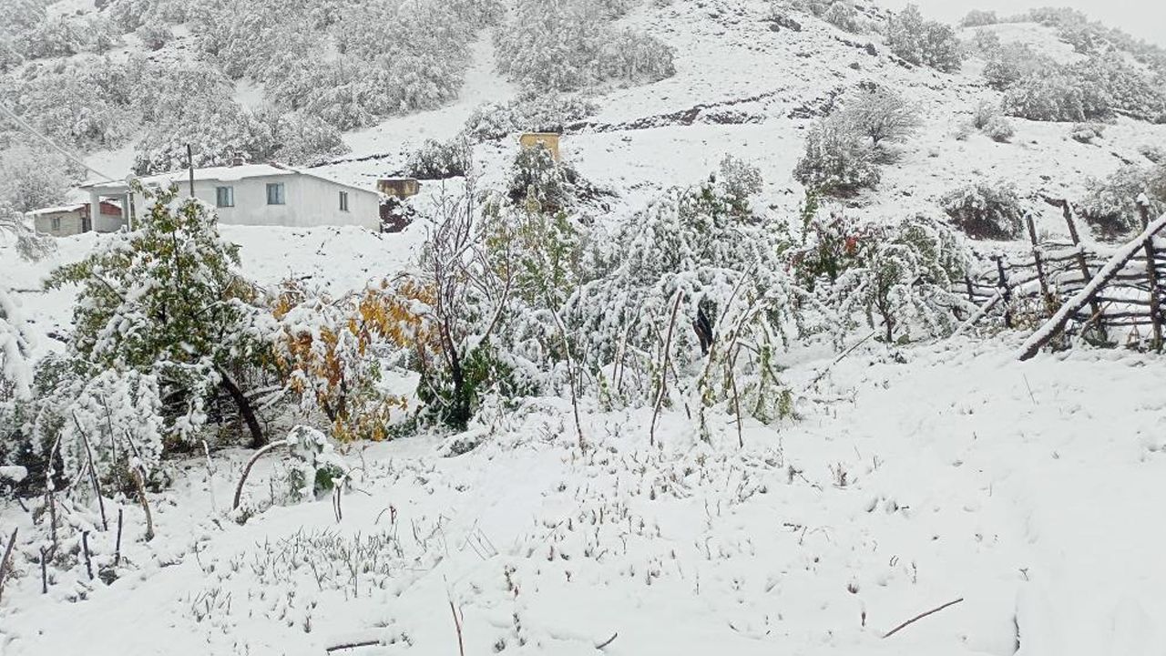 Erzincan’ın Tercan ilçesine bağlı yüksek kesimler yağan karla birlikte beyaza büründü. Erken bastıran kış nedeniyle hasadı yapılmayan ceviz beyaz örtü altında kaldı.