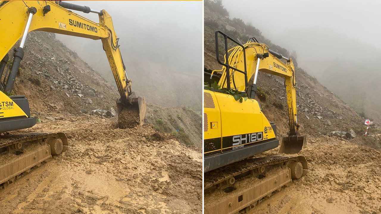 Yayla yolunu ulaşıma açmaya çalışan iş makinesi, yamaçtan kopan toprağın kaymasıyla heyelanın altında kalmaktan saniyelerle kurtuldu.