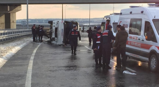 Kaza, Arnavutköy Tayakadın yol ayrımı İstanbul Havalimanı istikametinde saat 08.00 sıralarında meydana geldi. Edinilen bilgiye göre, havalimanına temizlik personelini taşıyan midibüs sürücünün direksiyon hakimiyetini kaybetmesiyle bariyerlere çarptı. Kayganlaşan yolda yan yatan midibüsteki 1’i ağır olmak üzere 9 personel yaralandı. İhbar üzerine olay yerine çok sayıda jandarma ve sağlık ekipleri sevk edildi. İlk müdahaleleri olay yerinde yapılan yaralılar 112 Acil Servis ekipleri tarafından ambulanslarla hastaneye kaldırıldı.