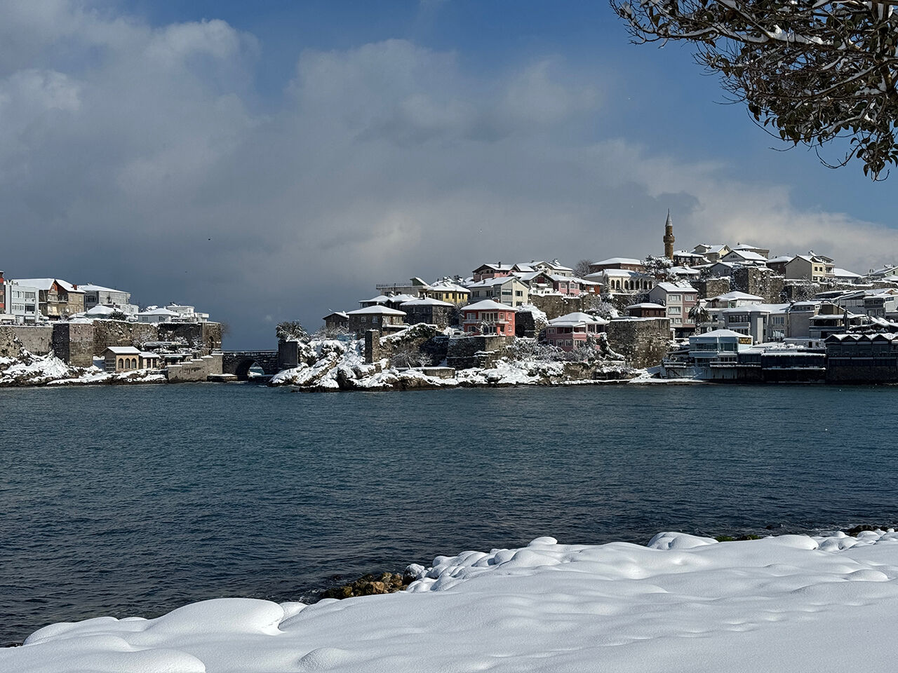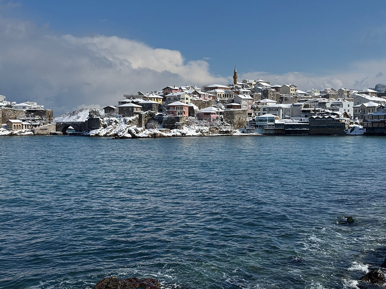 UNESCO Dünya Miras Geçici Listesi'ne 2015'te eklenen Bartın'ın Amasra ilçesi, kar yağışıyla beyaza büründü.