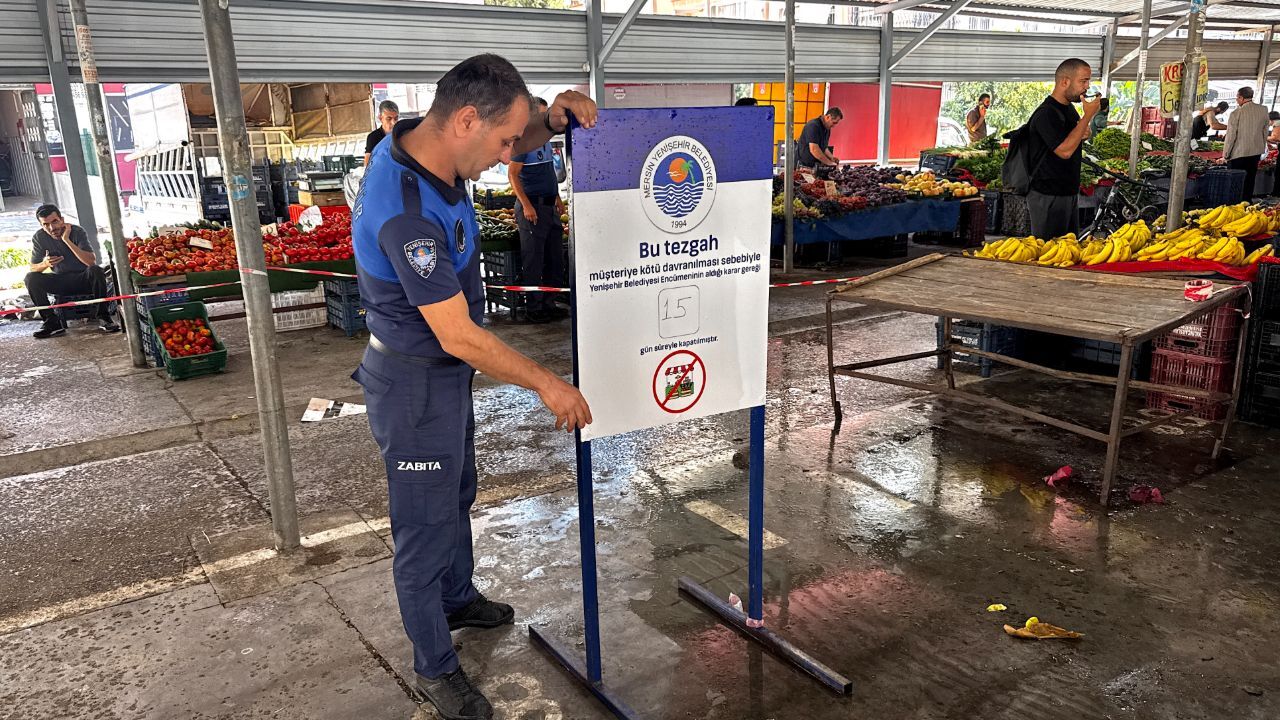 Mersin'in Yenişehir ilçesinde müşterisine kötü davrandığı belirlenen pazar esnafına 15 gün süreyle tezgah kapatma cezası uygulandı.