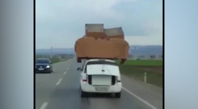 Batman-Hasankeyf karayolunda bir otomobilin üzerinde koltuk takımı ve bagajında beyaz eşya ile seyrettiğini gören vatandaşlar şaşkına döndü. Otomobilin üzerine iple tutturulan koltuk takımının olduğunu gören vatandaşlar, telefonları ile tehlikeli yolculuğu kaydetti. Kamyonete bile zorlukla sığacak koltuk takımının otomobilin üzerine konularak trafiğe çıkılması sürücülerin tepkisini çekti.