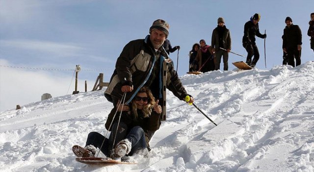 Yerli ve yabancı turistlerin mangal yakıp horon oynayarak karın tadını çıkardığı şenlikte, bazı vatandaşlar da naylon poşetlerle kaymaya çalıştı.