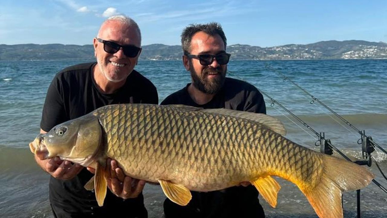 Taha Tarhan isimli balıkçının babasıyla Sapanca Gölü'ne attığı oltasına yaklaşık 18 kilogram ağırlığında ve devasa boyutta sazan takıldı.