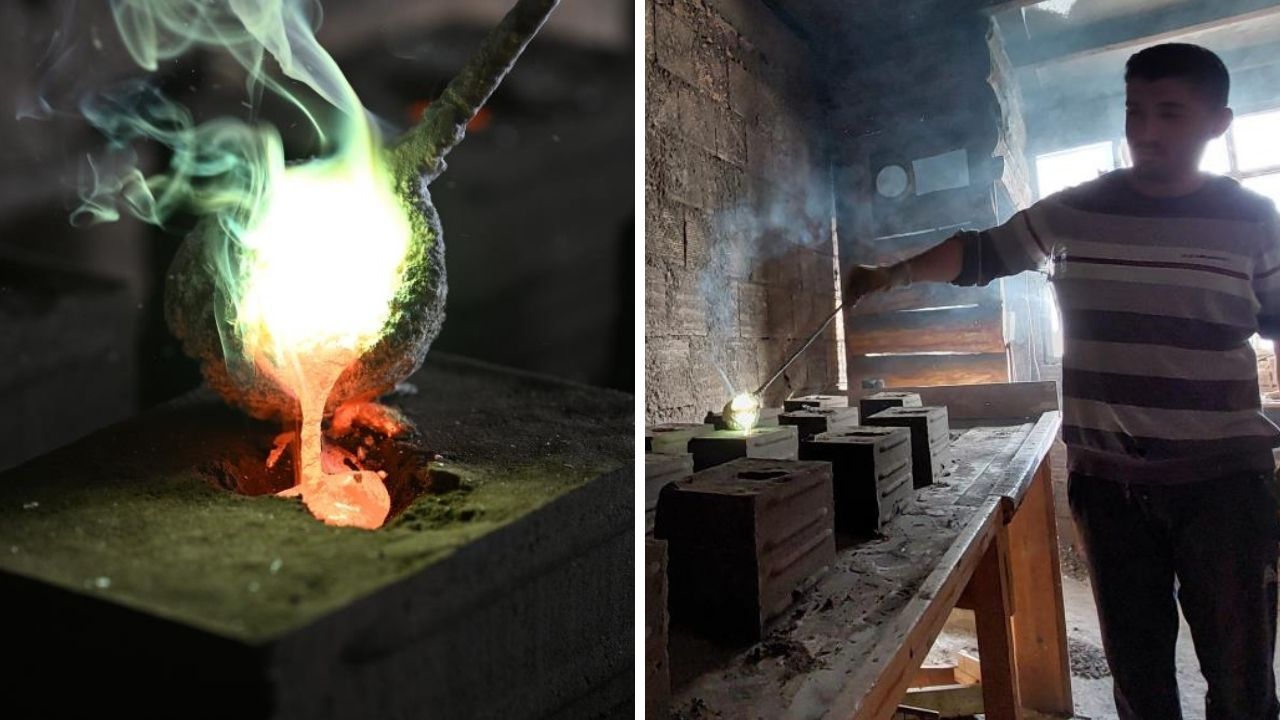 "İlk önce 'göbek' dediğimiz maşaları hazırlıyoruz. Ardından Konya'da özel olarak yaptırdığım kalıplara, erittiğimiz sarı malzemeyi döküyoruz."