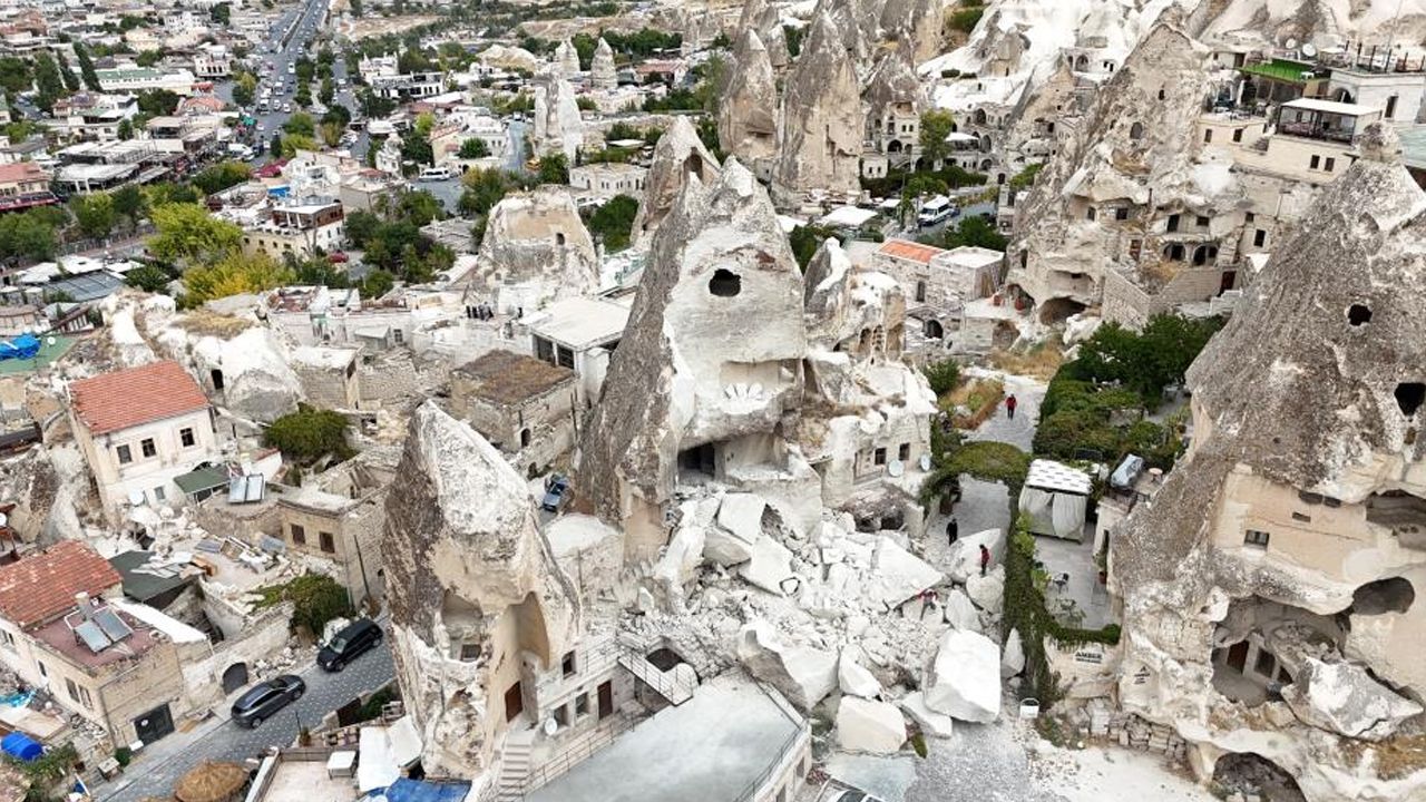 Dünya mirası Kapadokya’da gece saatlerinde panik dolu anlar yaşandı. Nevşehir’in Göreme beldesinde bulunan peribacalarından biri yıkıldı. Olayda şans eseri yaralanan olmazken Kapadokya Alan Başkanı Cem Aslanbay, "İklim değişikliğinin neden olduğu sıcaklık farkları ve donma-çözünme etkisi nedeniyle güney cephesinde kaya kopması meydana geldi" ifadelerini kullandı.