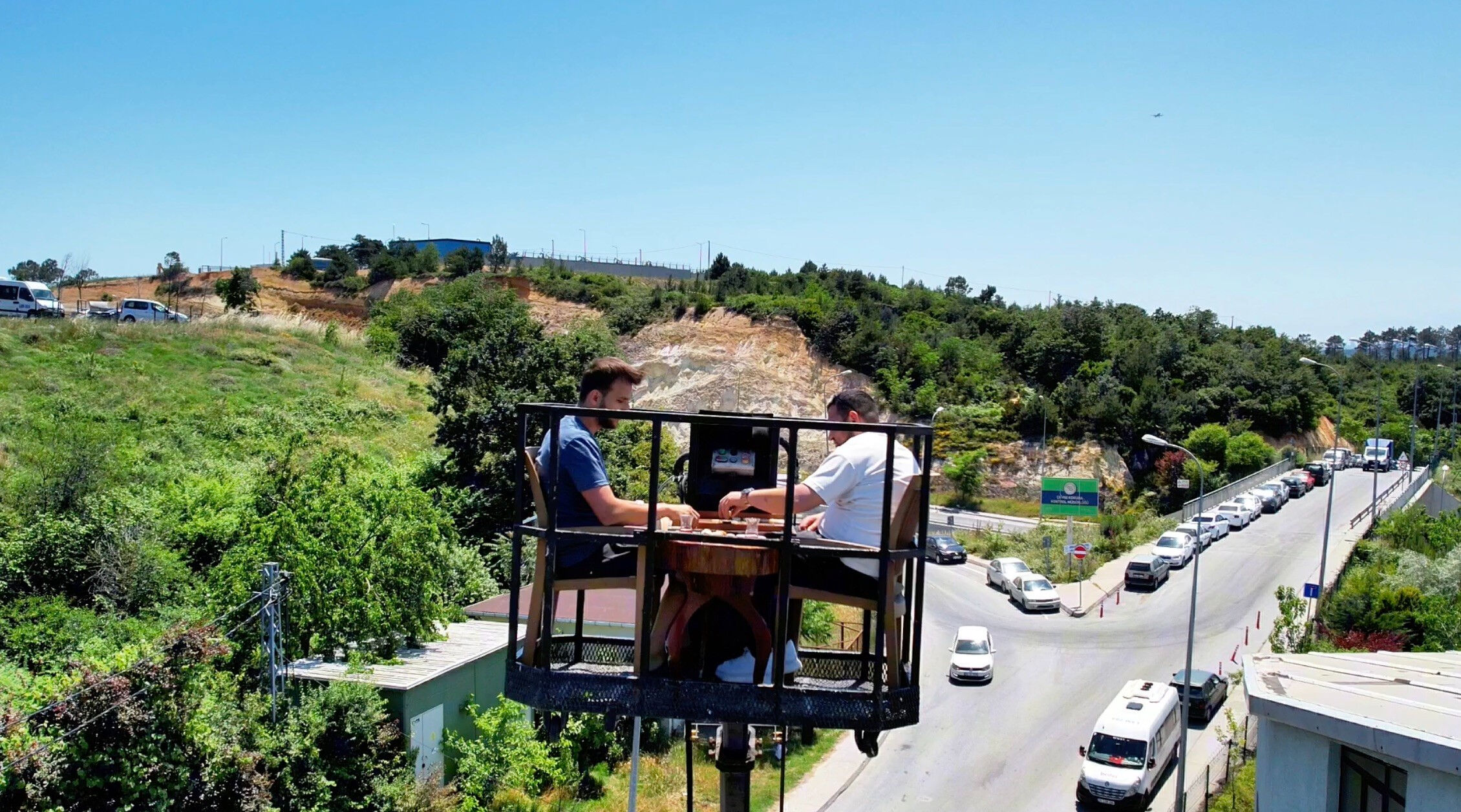 Arnavutköy Merkez Mahallesi’nde bulunan butik kafeye gelen 2 kişi, işletme sahibiyle şakalaşarak teras manzarası sordu. İşletme sahibinin şaka yapmak maksadıyla sorduğu ‘Vinç çağırayım mı?’ sorusuna 'Evet' cevabı veren müşteriler için vinç çağrıldı. Vinçle 40 metre yüksekliğe çıkartılan 2 kişi, çay içerek tavla oynadı. O anlar dron kamerasıyla görüntülenirken, yapılan şakanın gerçek olması herkesi hayrete düşürdü. 40 metre yükseklikte orman manzarasında çay içerek tavla oynayan kişileri görenler de merakla izledi.