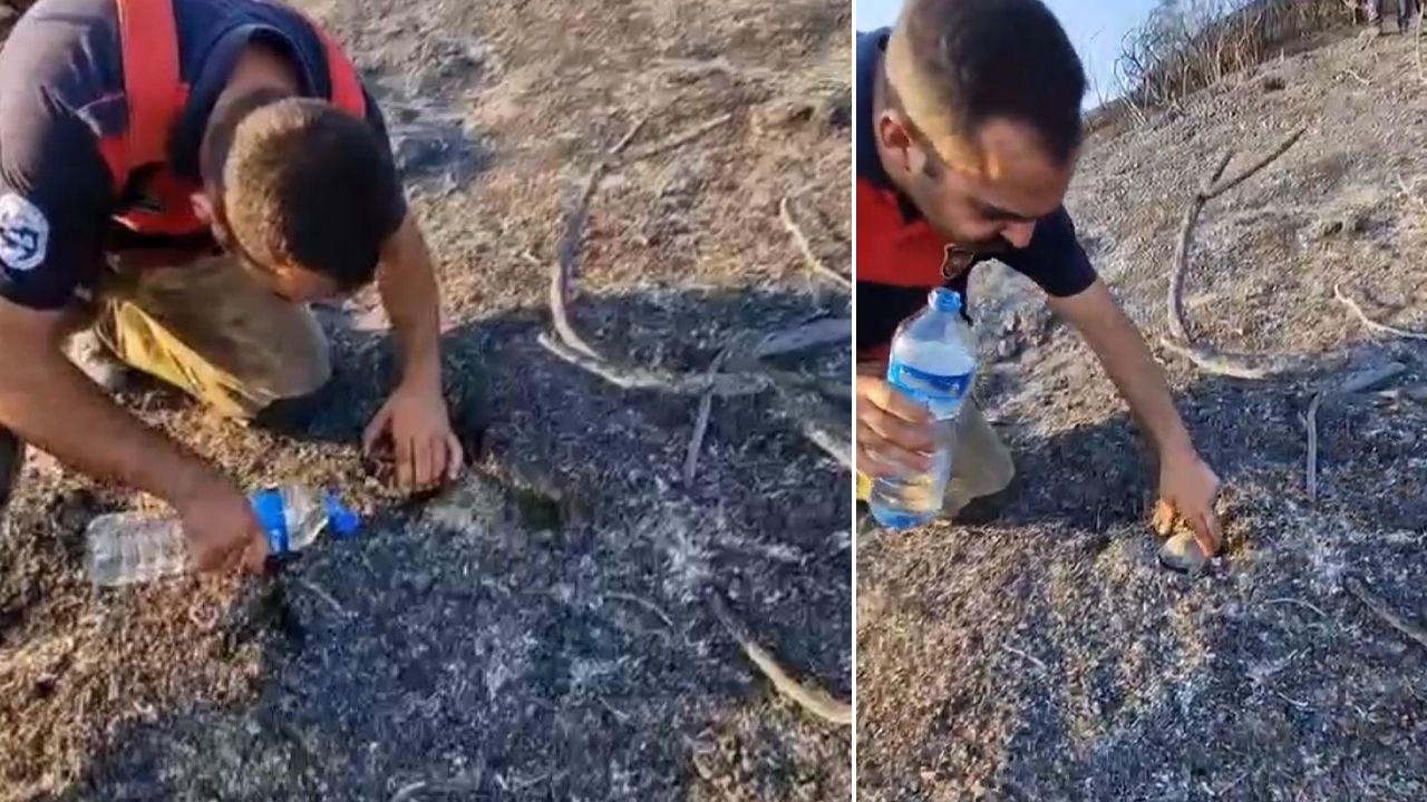 O esnada su içen itfaiye eri, elindeki şişeden can suyu vererek kaplumbağayı serinletti. Şişe kapağından su içen kaplumbağa kısa sürede toparlandı.